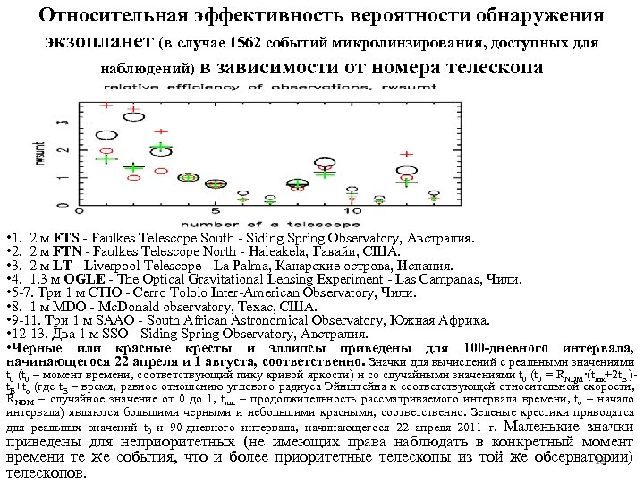 Относительная эффективность вероятности обнаружения экзопланет (в случае 1562 событий микролинзирования, доступных для наблюдений) в зависимости от номера телескопа • 1. 2 м FTS - Faulkes Telescope South - Siding Spring Observatory, Австралия. • 2. 2 м FTN - Faulkes Telescope North - Haleakela, Гавайи, США. • 3. 2 м LT - Liverpool Telescope - La Palma, Канарские острова, Испания. • 4. 1. 3 м OGLE - The Optical Gravitational Lensing Experiment - Las Campanas, Чили. • 5 -7. Три 1 м CTIO - Cerro Tololo Inter-American Observatory, Чили. • 8. 1 м MDO - Mc. Donald observatory, Техас, США. • 9 -11. Три 1 м SAAO - South African Astronomical Observatory, Южная Африка. • 12 -13. Два 1 м SSO - Siding Spring Observatory, Австралия. • Черные или красные кресты и эллипсы приведены для 100 -дневного интервала, начинающегося 22 апреля и 1 августа, соответственно. Значки для вычислений с реальными значениями t 0 (t 0 – момент времени, соответствующий пику кривой яркости) и со случайными значениями t 0 (t 0 = RNDM∙(tmx+2 t. E )t. E+to (где t. E – время, равное отношению углового радиуса Эйнштейна к соответствующей относительной скорости, RNDM – случайное значение от 0 до 1, tmx – продолжительность рассматриваемого интервала времени, to – начало интервала) являются большими черными и небольшими красными, соответственно. Зеленые крестики приводятся для реальных значений t 0 и 90 -дневного интервала, начинающегося 22 апреля 2011 г. Маленькие значки приведены для неприоритетных (не имеющих права наблюдать в конкретный момент времени те же события, что и более приоритетные телескопы из той же обсерватории) 18 телескопов.