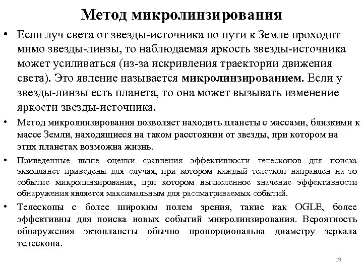 Метод микролинзирования • Если луч света от звезды-источника по пути к Земле проходит мимо звезды-линзы, то наблюдаемая яркость звезды-источника может усиливаться (из-за искривления траектории движения света). Это явление называется микролинзированием. Если у звезды-линзы есть планета, то она может вызывать изменение яркости звезды-источника. • Метод микролинзирования позволяет находить планеты с массами, близкими к массе Земли, находящиеся на таком расстоянии от звезды, при котором на этих планетах возможна жизнь. • Приведенные выше оценки сравнения эффективности телескопов для поиска экзопланет приведены для случая, при котором каждый телескоп направлен на то событие микролинзирования, при котором вычисленное значение эффективности обнаружения является максимальным для рассматриваемых событий. • Телескопы с более широким полем зрения, такие как OGLE, более эффективны для поиска новых событий микролинзирования. Вероятность обнаружения экзопланеты обычно пропорциональна диаметру зеркала телескопа. 19