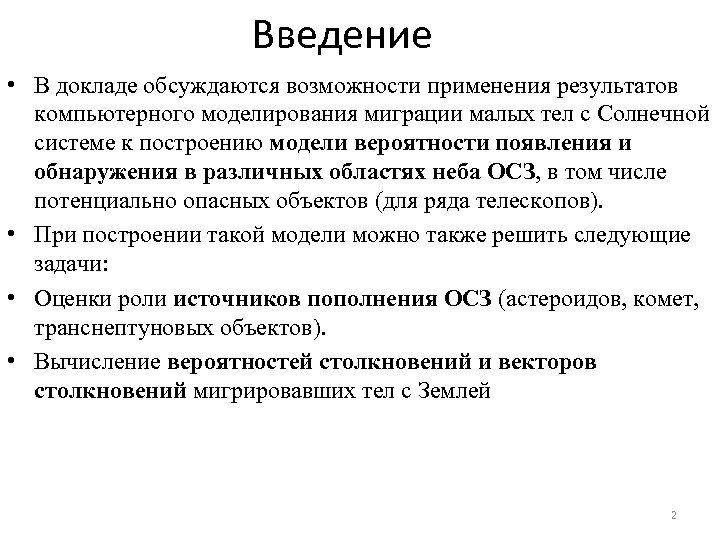 Введение • В докладе обсуждаются возможности применения результатов компьютерного моделирования миграции малых тел с Солнечной системе к построению модели вероятности появления и обнаружения в различных областях неба ОСЗ, в том числе потенциально опасных объектов (для ряда телескопов). • При построении такой модели можно также решить следующие задачи: • Оценки роли источников пополнения ОСЗ (астероидов, комет, транснептуновых объектов). • Вычисление вероятностей столкновений и векторов столкновений мигрировавших тел с Землей 2