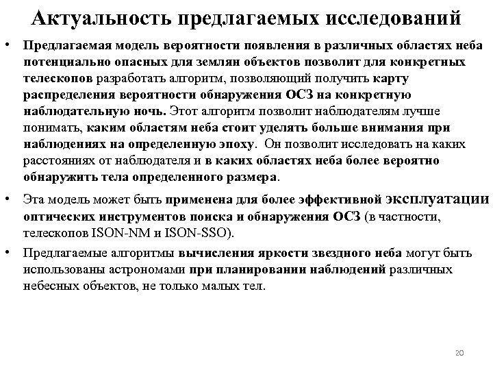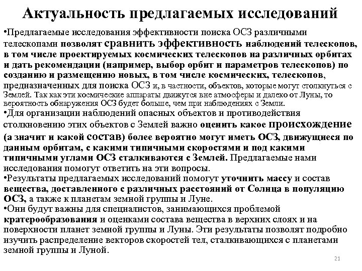 Актуальность предлагаемых исследований • Предлагаемая модель вероятности появления в различных областях неба потенциально опасных для землян объектов позволит для конкретных телескопов разработать алгоритм, позволяющий получить карту распределения вероятности обнаружения ОСЗ на конкретную наблюдательную ночь. Этот алгоритм позволит наблюдателям лучше понимать, каким областям неба стоит уделять больше внимания при наблюдениях на определенную эпоху. Он позволит исследовать на каких расстояниях от наблюдателя и в каких областях неба более вероятно обнаружить тела определенного размера. • Эта модель может быть применена для более эффективной эксплуатации оптических инструментов поиска и обнаружения ОСЗ (в частности, телескопов ISON-NM и ISON-SSO). • Предлагаемые алгоритмы вычисления яркости звездного неба могут быть использованы астрономами при планировании наблюдений различных небесных объектов, не только малых тел. 20