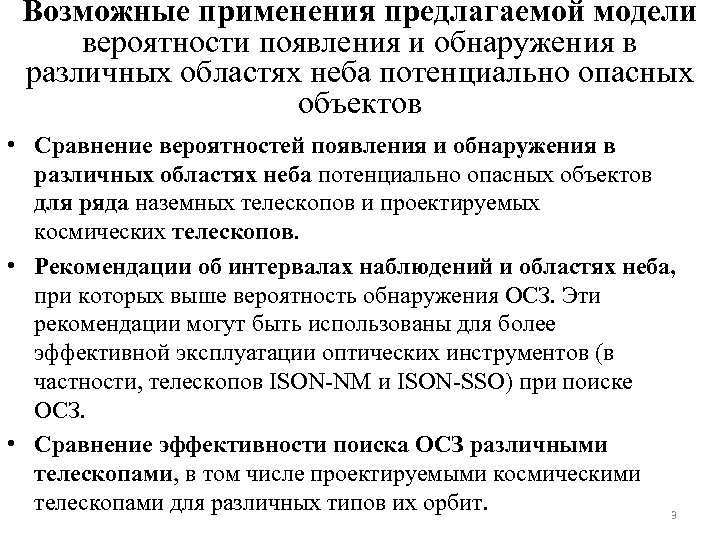 Возможные применения предлагаемой модели вероятности появления и обнаружения в различных областях неба потенциально опасных объектов • Сравнение вероятностей появления и обнаружения в различных областях неба потенциально опасных объектов для ряда наземных телескопов и проектируемых космических телескопов. • Рекомендации об интервалах наблюдений и областях неба, при которых выше вероятность обнаружения ОСЗ. Эти рекомендации могут быть использованы для более эффективной эксплуатации оптических инструментов (в частности, телескопов ISON-NM и ISON-SSO) при поиске ОСЗ. • Сравнение эффективности поиска ОСЗ различными телескопами, в том числе проектируемыми космическими телескопами для различных типов их орбит. 3