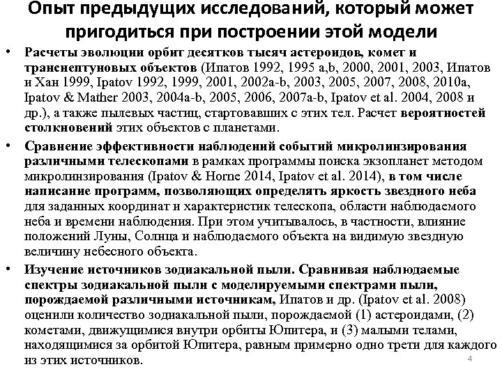 Опыт предыдущих исследований, который может пригодиться при построении этой модели • Расчеты эволюции орбит десятков тысяч астероидов, комет и транснептуновых объектов (Ипатов 1992, 1995 а, b, 2000, 2001, 2003, Ипатов и Хан 1999, Ipatov 1992, 1999, 2001, 2002 a-b, 2003, 2005, 2007, 2008, 2010 a, Ipatov & Mather 2003, 2004 a-b, 2005, 2006, 2007 a-b, Ipatov et al. 2004, 2008 и др. ), а также пылевых частиц, стартовавших с этих тел. Расчет вероятностей столкновений этих объектов с планетами. • Cравнение эффективности наблюдений событий микролинзирования различными телескопами в рамках программы поиска экзопланет методом микролинзирования (Ipatov & Horne 2014, Ipatov et al. 2014), в том числе написание программ, позволяющих определять яркость звездного неба для заданных координат и характеристик телескопа, области наблюдаемого неба и времени наблюдения. При этом учитывалось, в частности, влияние положений Луны, Солнца и наблюдаемого объекта на видимую звездную величину небесного объекта. • Изучение источников зодиакальной пыли. Сравнивая наблюдаемые спектры зодиакальной пыли с моделируемыми спектрами пыли, порождаемой различными источникам, Ипатов и др. (Ipatov et al. 2008) оценили количество зодиакальной пыли, порождаемой (1) астероидами, (2) кометами, движущимися внутри орбиты Юпитера, и (3) малыми телами, находящимися за орбитой Юпитера, равным примерно одно трети для каждого 4 из этих источников.