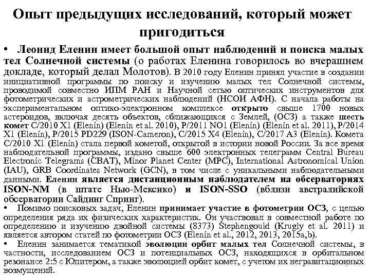 Опыт предыдущих исследований, который может пригодиться • Леонид Еленин имеет большой опыт наблюдений и поиска малых тел Солнечной системы (о работах Еленина говорилось во вчерашнем докладе, который делал Молотов). В 2010 году Еленин принял участие в создании инициативной программы по поиску и изучению малых тел Солнечной системы, проводимой совместно ИПМ РАН и Научной сетью оптических инструментов для фотометрических и астрометрических наблюдений (НСОИ АФН). С начала работы на экспериментальном оптико-электронном комплексе открыто свыше 1700 новых астероидов, включая десять объектов, сближающихся с Землей, (ОСЗ) а также шесть комет C/2010 X 1 (Elenin) (Elenin et al. 2010), P/2011 NO 1 (Elenin) (Elenin et al. 2011), P/2014 X 1 (Elenin), P/2015 PD 229 (ISON-Cameron), C/2015 X 4 (Elenin), C/2017 A 3 (Elenin). Комета C/2010 X 1 (Elenin) стала первой кометой, открытой в истории новой России. За все время наблюдательной программы, издано свыше 600 электронных телеграмм Central Bureau Electronic Telegrams (CBAT), Minor Planet Center (MPC), International Astronomical Union (IAU), GRB Coordinates Network (GCN), в том числе с уникальными наблюдательными данными. Еленин является дистанционным наблюдателем на обсерваториях ISON-NM (в штате Нью-Мексико) и ISON-SSO (вблизи австралийской обсерватории Сайдинг Спринг). • Помимо поисковых задач, Еленин принимает участие в фотометрии ОСЗ, с целью определения ряда их физических характеристик. Он участвовал в совместной работе по определению и изучению двойной системы (8373) Stephengould (Krugly et al. 2011) и является автором статей по фотометрии ОСЗ (Elenin et al. , 2012, 2013, 2015 a, b). • Еленин занимается тематикой эволюции орбит малых тел Солнечной системы, в частности, исследованием ОСЗ и потенциальных ОСЗ, находящихся в орбитальном резонансе 2: 5 с Юпитером, а также эволюцией орбит комет, с учетом их негравитационных 5 возмущений.