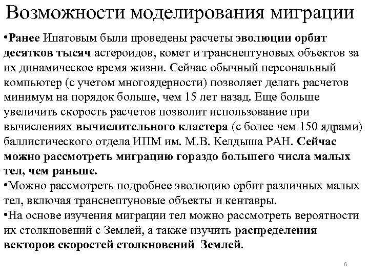 Возможности моделирования миграции • Ранее Ипатовым были проведены расчеты эволюции орбит десятков тысяч астероидов, комет и транснептуновых объектов за их динамическое время жизни. Сейчас обычный персональный компьютер (с учетом многоядерности) позволяет делать расчетов минимум на порядок больше, чем 15 лет назад. Еще больше увеличить скорость расчетов позволит использование при вычислениях вычислительного кластера (с более чем 150 ядрами) баллистического отдела ИПМ им. М. В. Келдыша РАН. Сейчас можно рассмотреть миграцию гораздо большего числа малых тел, чем раньше. • Можно рассмотреть подробнее эволюцию орбит различных малых тел, включая транснептуновые объекты и кентавры. • На основе изучения миграции тел можно рассмотреть вероятности их столкновений с Землей, а также изучить распределения векторов скоростей столкновений Землей. 6