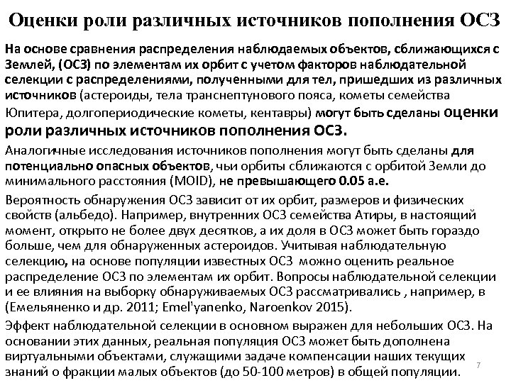 Оценки роли различных источников пополнения ОСЗ На основе сравнения распределения наблюдаемых объектов, сближающихся с Землей, (ОСЗ) по элементам их орбит с учетом факторов наблюдательной селекции с распределениями, полученными для тел, пришедших из различных источников (астероиды, тела транснептунового пояса, кометы семейства Юпитера, долгопериодические кометы, кентавры) могут быть сделаны оценки роли различных источников пополнения ОСЗ. Аналогичные исследования источников пополнения могут быть сделаны для потенциально опасных объектов, чьи орбиты сближаются с орбитой Земли до минимального расстояния (MOID), не превышающего 0. 05 а. е. Вероятность обнаружения ОСЗ зависит от их орбит, размеров и физических свойств (альбедо). Например, внутренних ОСЗ семейства Атиры, в настоящий момент, открыто не более двух десятков, а их доля в ОСЗ может быть гораздо больше, чем для обнаруженных астероидов. Учитывая наблюдательную селекцию, на основе популяции известных ОСЗ можно оценить реальное распределение ОСЗ по элементам их орбит. Вопросы наблюдательной селекции и ее влияния на выборку обнаруживаемых ОСЗ рассматривались , например, в (Емельяненко и др. 2011; Emel'yanenko, Naroenkov 2015). Эффект наблюдательной селекции в основном выражен для небольших ОСЗ. На основании этих данных, реальная популяция ОСЗ может быть дополнена виртуальными объектами, служащими задаче компенсации наших текущих 7 знаний о фракции малых объектов (до 50 -100 метров) в общей популяции.