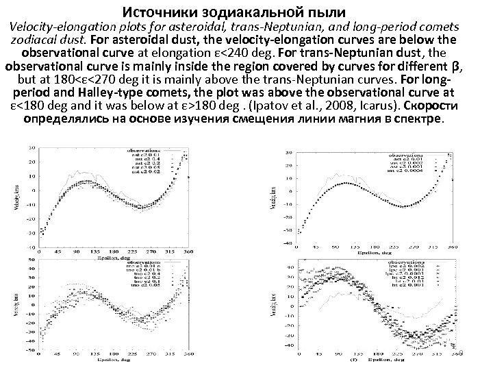 Источники зодиакальной пыли Velocity-elongation plots for asteroidal, trans-Neptunian, and long-period comets zodiacal dust. For asteroidal dust, the velocity-elongation curves are below the observational curve at elongation ε<240 deg. For trans-Neptunian dust, the observational curve is mainly inside the region covered by curves for different β, but at 180<ε<270 deg it is mainly above the trans-Neptunian curves. For longperiod and Halley-type comets, the plot was above the observational curve at ε<180 deg and it was below at ε>180 deg. (Ipatov et al. , 2008, Icarus). Скорости определялись на основе изучения смещения линии магния в спектре. 9
