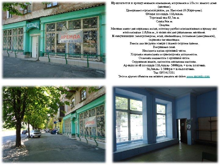Предлагается в аренду нежилое помещение, встроенное в 1/3 х эт. жилого дома (магазин). Центрально городской район, ул. Ньютона 18 (Карачуны). Общая площадь 118, 6 кв. м. Торговый зал 83, 7 кв. м. Склад 9 кв. м. Санузел. Магазин имеет два парадных входа, поэтому удобно использование в аренду как всей площади 118, 6 кв. м. , а также как два раздельных магазина. Коммуникации: электроэнергия, вода, канализация, отопление (центральное), охранная сигнализация. Выход для загрузки товара с задней стороны здания. Витражные окна. Находится вдоль проезжей части. Хорошая пешеходная и транспортная доступность. Отличная видимость с проезжей части. Окружение жилое, плотность населения высокая. Аренда: всей площади 118, 6 кв. м. - 5000 грн. + ком. платежи. 59, 3 кв. м. - 2 500 грн + ком. платежи. Тел: 0975417331 Этот и другие объекты вы можете увидеть на сайте www. ancredo. com