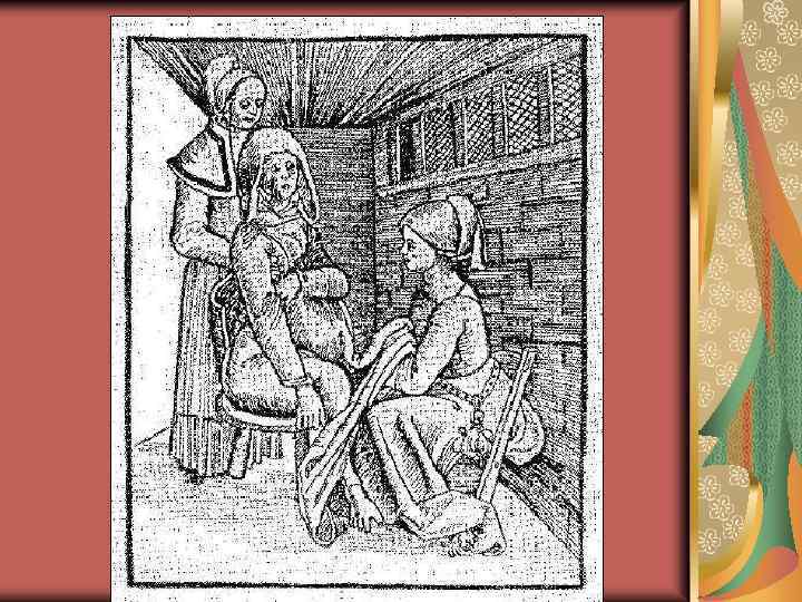 В Древней Руси – уровень медицинской помощи был весьма не высок, царские и боярские жены рожали с помощью бабок – повитух, или повивальных бабок. Акушерство в России (как часть медицины) развивалась в русле общемирового развития (Галлен, Гиппократ), но и имело свои особенности, связанные с историей страны (были лечебницы – монастырские, светские, частные – избы богорадные, богодельни). 16 17 век русское правительство обязывало врачей иностранцев обучать русских врачебному делу. Иван IY учредил аптекарский приказ. .