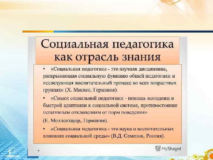 Социальная педагогика Ø научная дисциплина, раскрывающая социальную функцию общей педагогики и исследующая воспитательный процесс во всех возрастных группах (Х. Мискес, Германия); Ø помощь молодежи в быстрой адаптации к социальной системе, противостоянии негативным отклонениям от норм поведения (Е. Молленхауэр, Германия); Ø наука о воспитательных влияниях социальной среды (В. Д. Семенов, Россия).