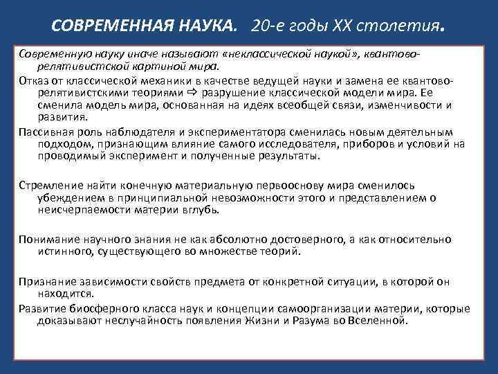 СОВРЕМЕННАЯ НАУКА. 20 -е годы ХХ столетия . Современную науку иначе называют «неклассической наукой» , квантово- релятивистской картиной мира. Отказ от классической механики в качестве ведущей науки и замена ее квантово- релятивистскими теориями разрушение классической модели мира. Ее сменила модель мира, основанная на идеях всеобщей связи, изменчивости и развития. Пассивная роль наблюдателя и экспериментатора сменилась новым деятельным подходом, признающим влияние самого исследователя, приборов и условий на проводимый эксперимент и полученные результаты. Стремление найти конечную материальную первооснову мира сменилось убеждением в принципиальной невозможности этого и представлением о неисчерпаемости материи вглубь. Понимание научного знания не как абсолютно достоверного, а как относительно истинного, существующего во множестве теорий. Признание зависимости свойств предмета от конкретной ситуации, в которой он находится. Развитие биосферного класса наук и концепции самоорганизации материи, которые доказывают неслучайность появления Жизни и Разума во Вселенной.