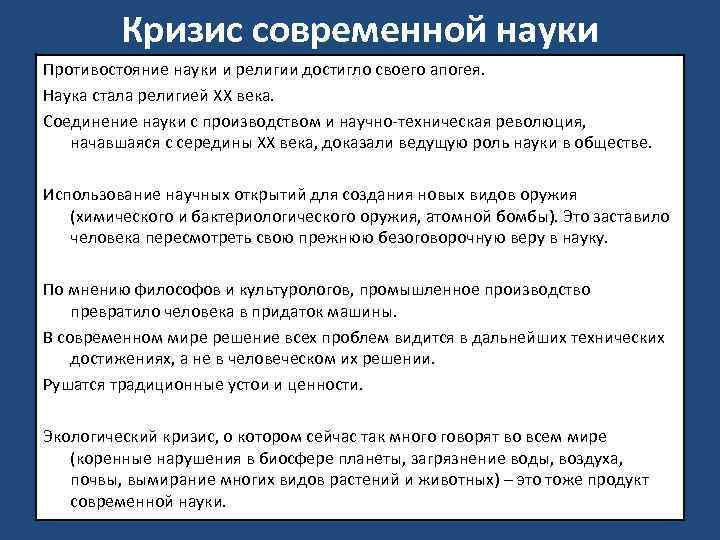 Кризис современной науки Противостояние науки и религии достигло своего апогея. Наука стала религией ХХ века. Соединение науки с производством и научно-техническая революция, начавшаяся с середины ХХ века, доказали ведущую роль науки в обществе. Использование научных открытий для создания новых видов оружия (химического и бактериологического оружия, атомной бомбы). Это заставило человека пересмотреть свою прежнюю безоговорочную веру в науку. По мнению философов и культурологов, промышленное производство превратило человека в придаток машины. В современном мире решение всех проблем видится в дальнейших технических достижениях, а не в человеческом их решении. Рушатся традиционные устои и ценности. Экологический кризис, о котором сейчас так много говорят во всем мире (коренные нарушения в биосфере планеты, загрязнение воды, воздуха, почвы, вымирание многих видов растений и животных) – это тоже продукт современной науки.