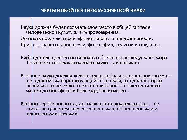 3. Постнеклассическая наука (вторая половина ХХ – начало ХХI вв. ) • характеризуется постоянной включенностью субъективной деятельности в «тело знания» . Она учитывает соотнесенность характера получаемых знаний об объекте не только с особенностью средств и операций деятельности познающего субъекта, но и с ее ценностно-целевыми структурами.