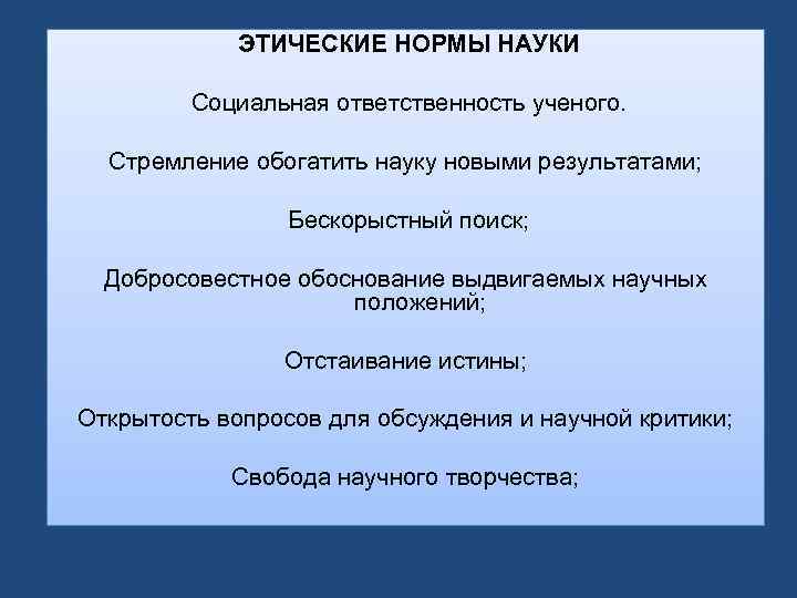 ЭТИЧЕСКИЕ НОРМЫ НАУКИ Социальная ответственность ученого. Стремление обогатить науку новыми результатами; Бескорыстный поиск; Добросовестное обоснование выдвигаемых научных положений; Отстаивание истины; Открытость вопросов для обсуждения и научной критики; Свобода научного творчества;