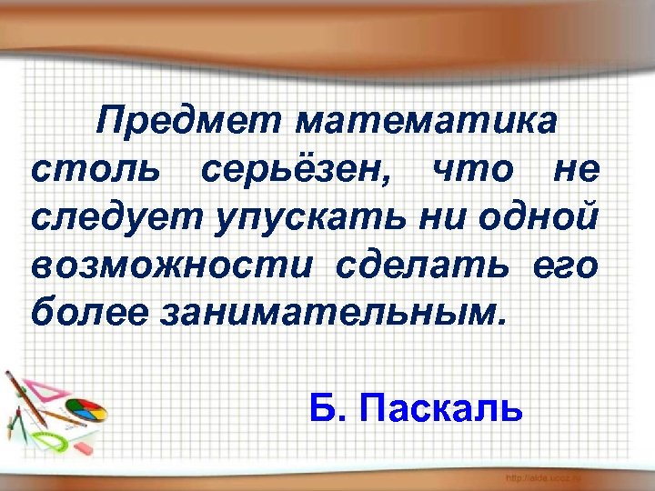 Предмет математика столь серьёзен, что не следует упускать ни одной возможности сделать его более занимательным. Б. Паскаль