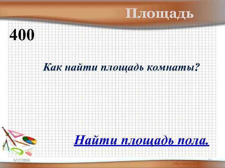 Площадь 400 Как найти площадь комнаты? Найти площадь пола. 3/17/2018 12