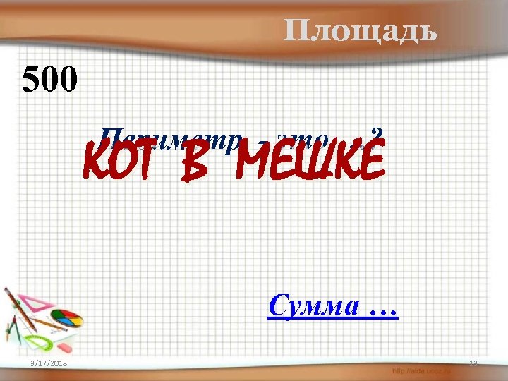 Площадь 500 Периметр - это …? КОТ В МЕШКЕ Сумма … 3/17/2018 13