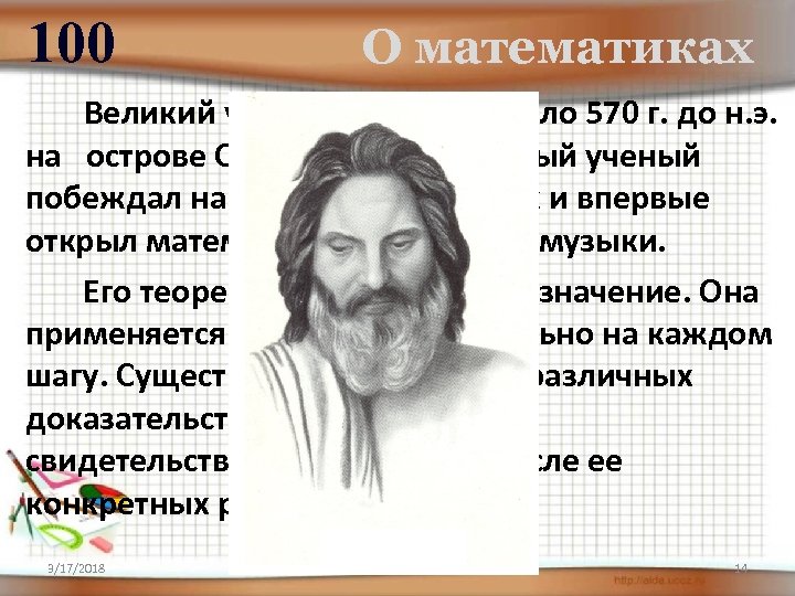 100 О математиках Великий ученый родился около 570 г. до н. э. на острове Самосе. Этот античный ученый побеждал на Олимпийских играх и впервые открыл математическую теорию музыки. Его теорема имеет огромное значение. Она применяется в геометрии буквально на каждом шагу. Существует около пятисот различных доказательств этой теоремы, что свидетельствует о гигантском числе ее конкретных реализации. 3/17/2018 14