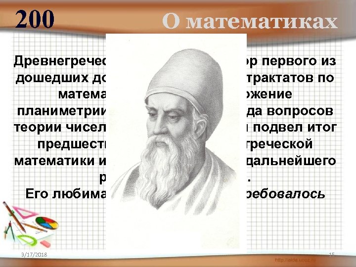 200 О математиках Древнегреческий математик, автор первого из дошедших до нас теоретических трактатов по математике. Содержит изложение планиметрии, стереометрии и ряда вопросов теории чисел. В своей работе он подвел итог предшествующему развитию греческой математики и создал фундамент дальнейшего развития математики. Его любимая фраза – «что и требовалось доказать» . 3/17/2018 15