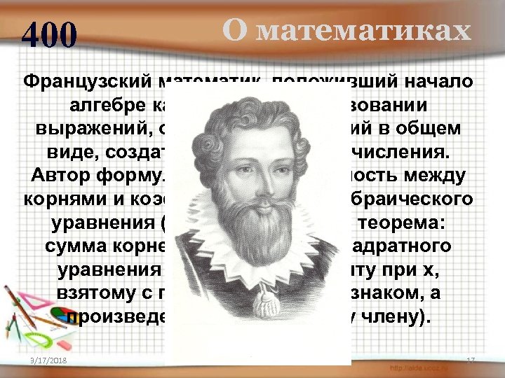 400 О математиках Французский математик, положивший начало алгебре как науке о преобразовании выражений, о решении уравнений в общем виде, создатель буквенного исчисления. Автор формул, дающих зависимость между корнями и коэффициентами алгебраического уравнения (установленная им теорема: сумма корней приведенного квадратного уравнения равна коэффициенту при x, взятому с противоположным знаком, а произведение — свободному члену). 3/17/2018 17