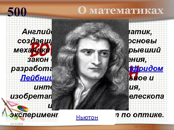 500 О математиках Английский физик и математик, создавший теоретические основы механики и астрономии, открывший закон всемирного тяготения, разработавший (наряду с Готфридом Лейбницем) дифференциальное и интегральное исчисления, изобретатель зеркального телескопа и автор важнейших экспериментальных работ по оптике. Ньютон ВОПРОС – АУКЦИОН 3/17/2018