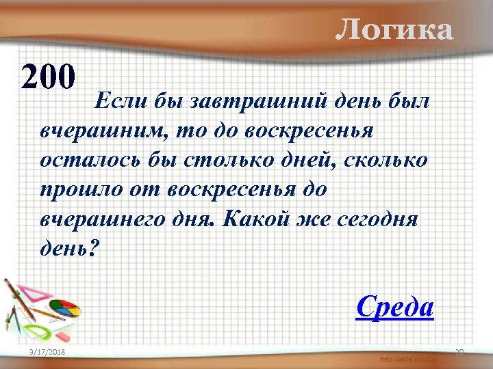 Логика 200 Если бы завтрашний день был вчерашним, то до воскресенья осталось бы столько дней, сколько прошло от воскресенья до вчерашнего дня. Какой же сегодня день? Среда 3/17/2018 20