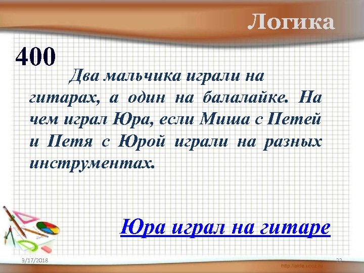 Логика 400 Два мальчика играли на гитарах, а один на балалайке. На чем играл Юра, если Миша с Петей и Петя с Юрой играли на разных инструментах. Юра играл на гитаре 3/17/2018 22