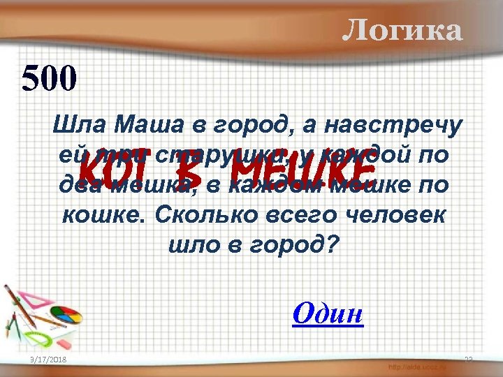 Логика 500 Шла Маша в город, а навстречу ей три старушки, у каждой по два мешка, в каждом мешке по кошке. Сколько всего человек шло в город? КОТ В МЕШКЕ Один 3/17/2018 23