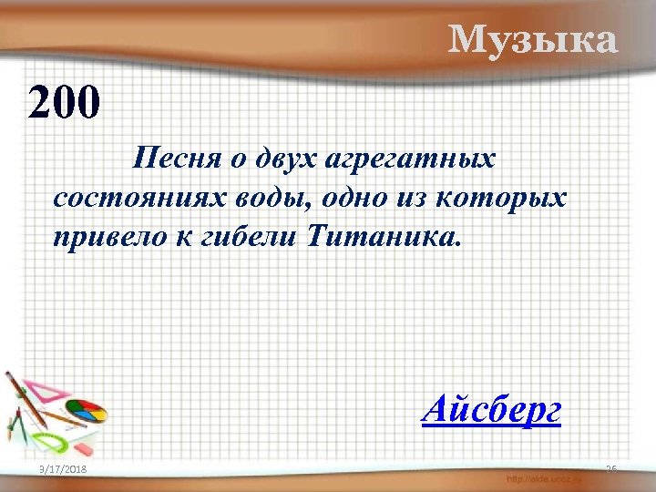 Музыка 200 Песня о двух агрегатных состояниях воды, одно из которых привело к гибели Титаника. Айсберг 3/17/2018 26
