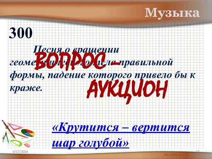 Музыка 300 Песня о вращении геометрического тела правильной формы, падение которого привело бы к краже. ВОПРОС – АУКЦИОН 3/17/2018 «Крутится – вертится шар голубой» 27