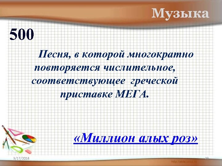 Музыка 500 Песня, в которой многократно повторяется числительное, соответствующее греческой приставке МЕГА. «Миллион алых роз» 3/17/2018 29