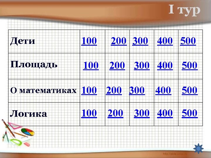 I тур Дети 100 200 300 400 500 Площадь 100 200 300 400 500 О математиках 100 200 300 Логика 100 200 400 500 3