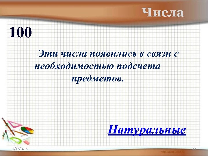 Числа 100 Эти числа появились в связи с необходимостью подсчета предметов. Натуральные 3/17/2018 30