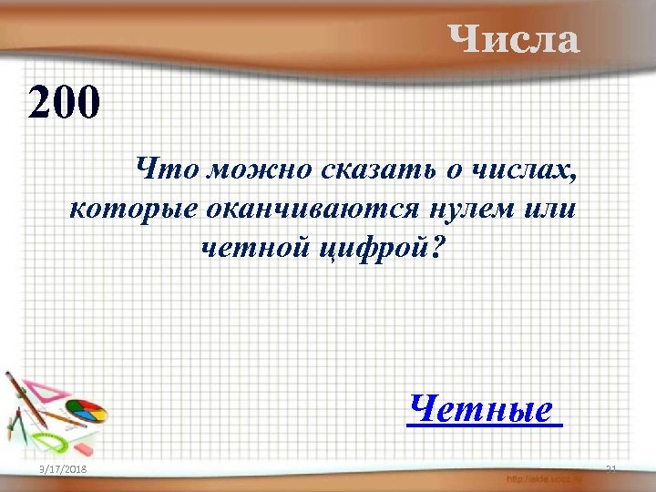 Числа 200 Что можно сказать о числах, которые оканчиваются нулем или четной цифрой? Четные 3/17/2018 31