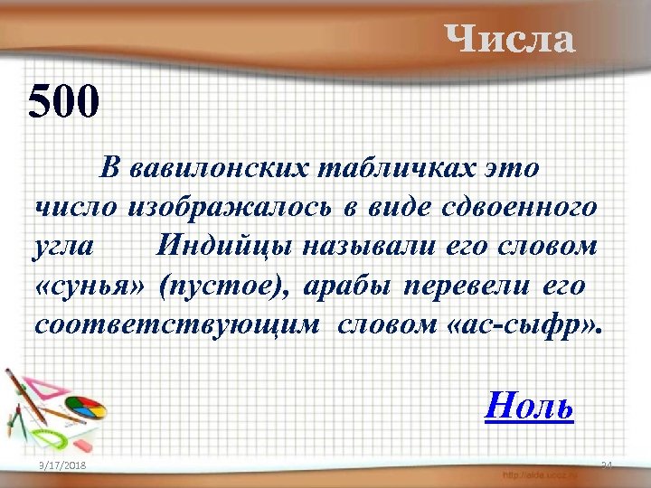 Числа 500 В вавилонских табличках это число изображалось в виде сдвоенного угла Индийцы называли его словом «сунья» (пустое), арабы перевели его соответствующим словом «ас-сыфр» . Ноль 3/17/2018 34