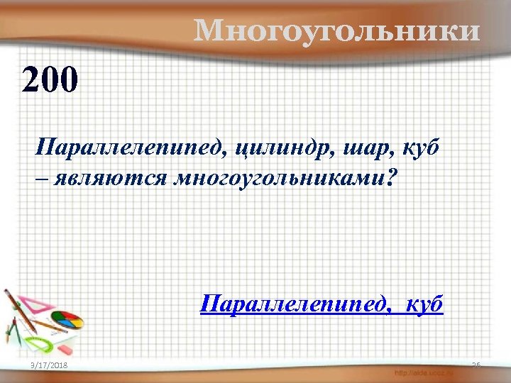 Многоугольники 200 Параллелепипед, цилиндр, шар, куб – являются многоугольниками? Параллелепипед, куб 3/17/2018 36