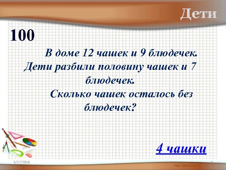 Дети 100 В доме 12 чашек и 9 блюдечек. Дети разбили половину чашек и 7 блюдечек. Сколько чашек осталось без блюдечек? 4 чашки 3/17/2018 4