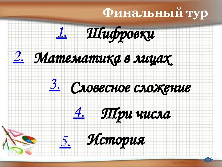 Финальный тур 1. Шифровки 2. Математика в лицах 3. Словесное сложение 4. Три числа 5. История