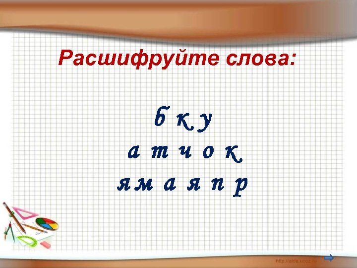 Расшифруйте слова: б к у а т ч о к ям а я п р