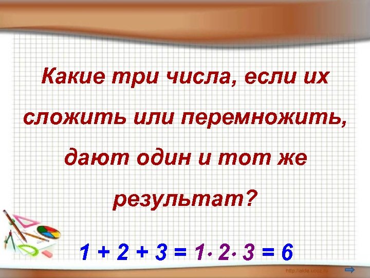 Какие три числа, если их сложить или перемножить, дают один и тот же результат? 1 + 2 + 3 = 1 2 3 = 6