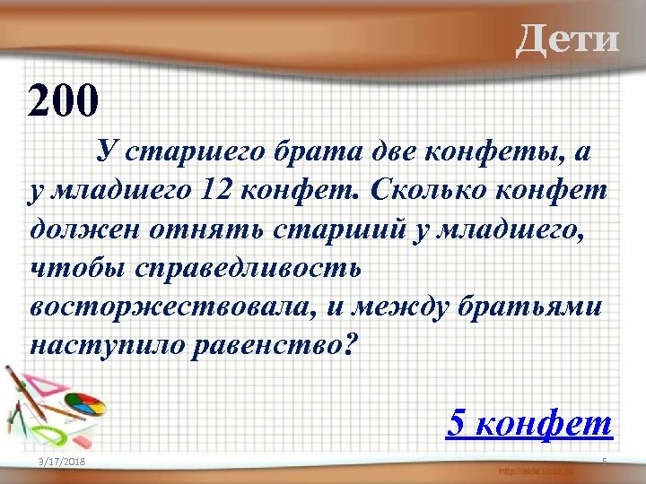 Дети 200 У старшего брата две конфеты, а у младшего 12 конфет. Сколько конфет должен отнять старший у младшего, чтобы справедливость восторжествовала, и между братьями наступило равенство? 5 конфет 3/17/2018 5
