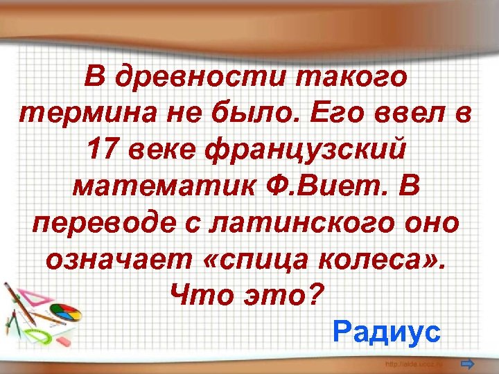 В древности такого термина не было. Его ввел в 17 веке французский математик Ф. Виет. В переводе с латинского оно означает «спица колеса» . Что это? Радиус