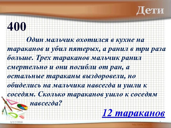 Дети 400 Один мальчик охотился в кухне на тараканов и убил пятерых, а ранил в три раза больше. Трех тараканов мальчик ранил смертельно и они погибли от ран, а остальные тараканы выздоровели, но обиделись на мальчика навсегда и ушли к соседям. Сколько тараканов ушло к соседям навсегда? 12 тараканов 3/17/2018 7