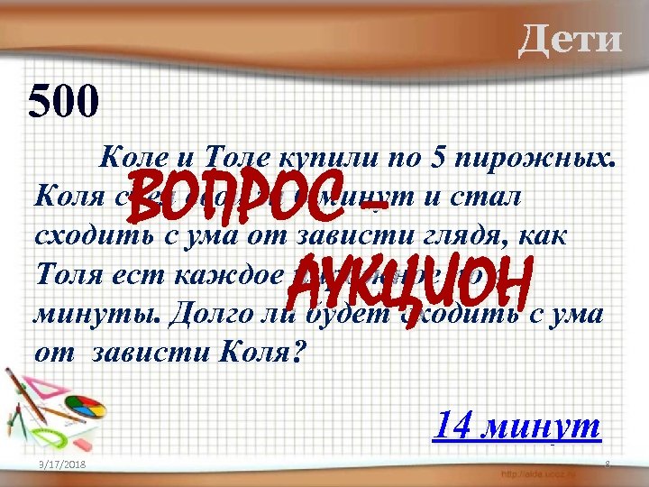 Дети 500 Коле и Толе купили по 5 пирожных. Коля съел свои за 6 минут и стал сходить с ума от зависти глядя, как Толя ест каждое пирожное по 4 минуты. Долго ли будет сходить с ума от зависти Коля? ВОПРОС – АУКЦИОН 14 минут 3/17/2018 8