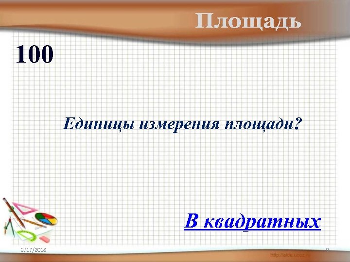 Площадь 100 Единицы измерения площади? В квадратных 3/17/2018 9
