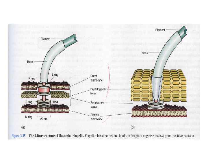 • Джгутики складаються з базального тільця, за допомогою якого вони кріпляться до бактерії, гачка і власне джгутика (білок флагелін). • Базальне тільце побудоване як система кілець, нанизаних на осьовий циліндр. В базальному тільці утворюється обертовий момент , який передається на джгутик, завдяки руху якого бактерія рухається. • Направлений рух бактерій називається таксис • (аеро-, хемофототаксис)