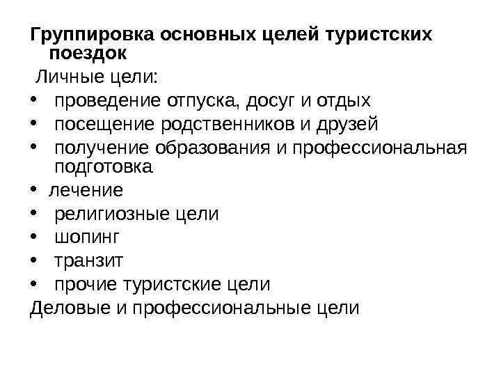 Группировка основных целей туристских поездок Личные цели: • проведение отпуска, досуг и отдых • посещение родственников и друзей • получение образования и профессиональная подготовка • лечение • религиозные цели • шопинг • транзит • прочие туристские цели Деловые и профессиональные цели