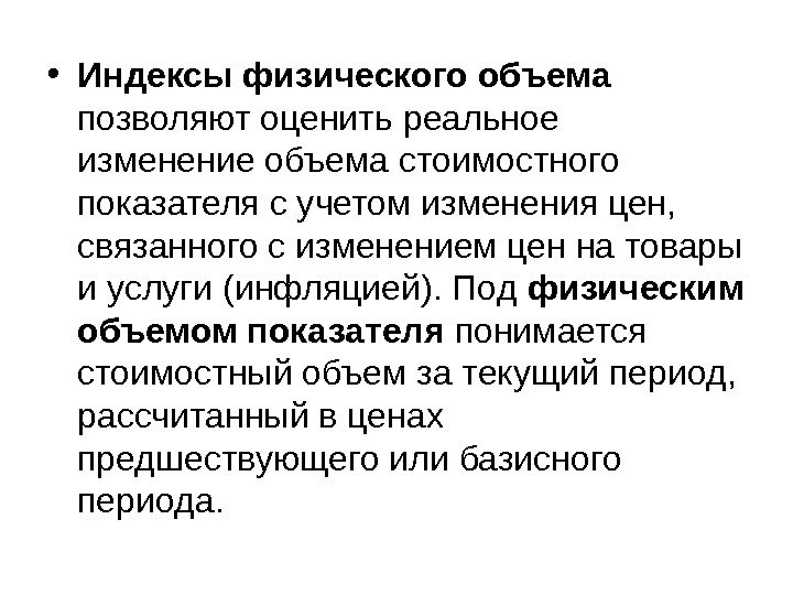 • Индексы физического объема позволяют оценить реальное изменение объема стоимостного показателя с учетом изменения цен, связанного с изменением цен на товары и услуги (инфляцией). Под физическим объемом показателя понимается стоимостный объем за текущий период, рассчитанный в ценах предшествующего или базисного периода.