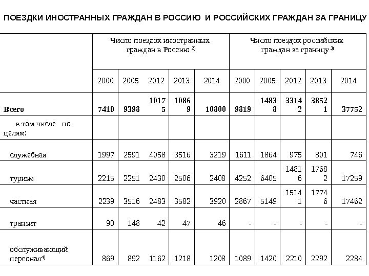ПОЕЗДКИ ИНОСТРАННЫХ ГРАЖДАН В РОССИЮ И РОССИЙСКИХ ГРАЖДАН ЗА ГРАНИЦУ ПО ЦЕЛЯМ 1) (страны дальнего зарубежья; тысяч) Число поездок иностранных граждан в Россию 2) Число поездок российских граждан за границу 3) 2000 2005 2012 2013 2014 Всего 7410 9398 1017 5 1086 9 10800 9819 1483 8 3314 2 3852 1 37752 в том числе по целям: служебная 1997 2591 4058 3516 3219 1611 1864 975 801 746 туризм 2215 2251 2430 2506 2408 4252 6405 1481 6 1768 2 17259 частная 2239 3516 2483 3582 3920 2867 5149 1514 1 1774 6 17462 транзит 90 148 42 47 46 — — — обслуживающий персонал 4)