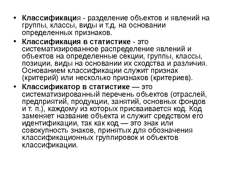 • Классификаци я — разделение объектов и явлений на группы, классы, виды и т. д. на основании определенных признаков. • Классификация в статистике — это систематизированное распределение явлений и объектов на определенные секции, группы, классы, позиции, виды на основании их сходства и различия. Основанием классификации служит признак (критерий) или несколько признаков (критериев). • Классификатор в статистике — это систематизированный перечень объектов (отраслей, предприятий, продукции, занятий, основных фондов и т. п. ), каждому из которых присваивается код. Код заменяет название объекта и служит средством его идентификации, так код — это знак или совокупность знаков, принятых для обозначения классификационных группировок и объектов классификации.