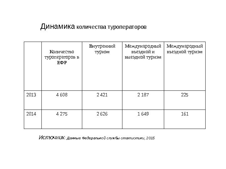 Динамика количества туроператоров Количество туроператоров в ЕФР Внутренний туризм Международный въездной и выездной туризм Международный въездной туризм 2013 4 608 2 421 2 187 225 2014 4 275 2 626 1 649 161 Источник : Данные Федеральной службы статистики,